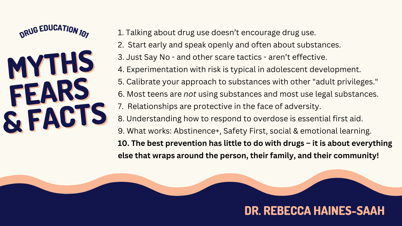 We’ve all heard slogans such as “Just Say No,” and “This is your brain on drugs,” from the bad anti-drug ads of the eighties – but what does the current evidence tell us actually works to young people safer? If you are interested in knowing more about drug education prevention for kids and teens, I have a very accessible (and actually kind of fun!) talk, “Drug Education 101,” that I offer FREE to schools and non-profits. This talk is appropriate for parents, educators, community workers, and also for youth ages 12 and up (grade 7/middle school). Get in touch and we can plan a webinar or in person talk for your group where you’ll discover why I say that the best prevention actually has very little to do with drugs!